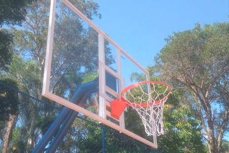 Tabelas de basquete, aros, redes e acessórios esportivos.